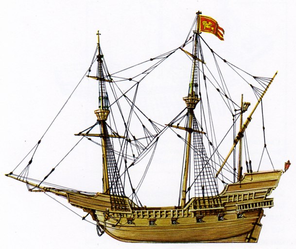 Le terme de galion est apparu au XIIIe siècle, dérivé de l'ancien français galie, variante de galée. A l'origine, bâtiment « rond » à voiles, pouvant occasionnellement armer des avirons. Dès le XVIe siècle, il s'agissait d'un navire de combat (espagnol ou anglais) dépassant 400 tonneaux, plus élancé et naviguant uniquement sous voiles, avec des superstructures se projetant à l'extérieur de l'étrave et un château avant en retrait. Une galerie de poupe courait autour de la dunette. Il mesurait 50 à 60 mètres de longueur, 20 à 25 mètres de largeur, avec un château de quatre à cinq étages à l'arrière. A trois ou quatre-mâts à voiles carrées, lourd, armé de 60 à 70 canons, il était principalement utilisé en Atlantique pour le transport de l'or et des matières précieuses des colonies d'Amérique ; il était la proie la plus convoitée des pirates, corsaires et flibustiers. Les galions naviguaient souvent en convois, protégés par de fortes escadres. Ce type de bâtiment se répandit dans toute l'Europe avec de nombreuses variantes et devint enfin le vaisseau. Les galions constituèrent la base de la marine espagnole pendant plus de deux siècles. Bien que le galion ait navigué surtout dans l'océan Atlantique, il s'était répandu en Méditerranée au cours du XVIe siècle. Le galion vénitien, navire de transport et de guerre de la république de Venise, était plus petit et plus manœuvrant que ses homologues espagnols ou anglais. |